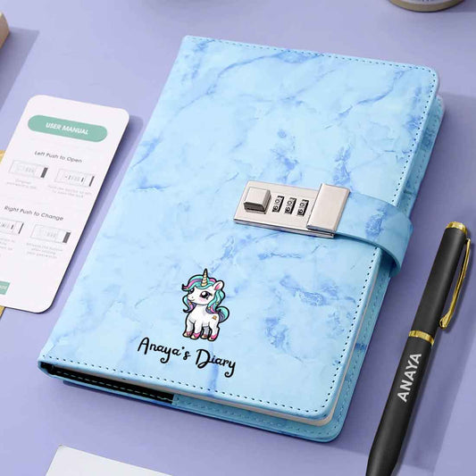 Custom Unicorn Diary with Lock - Marble Design Diaries with Pen