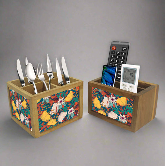 Retro Flower Cutlery Holder Stand Silverware Caddy Organizer for Spoons, Forks & Knives-Made of Pinewood