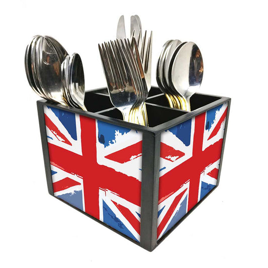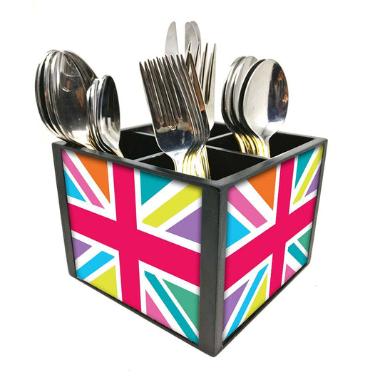 Multicolor Union Jack British Flag Cutlery Holder Stand Silverware Caddy Organizer for Spoons, Forks & Knives-Made of Pinewood