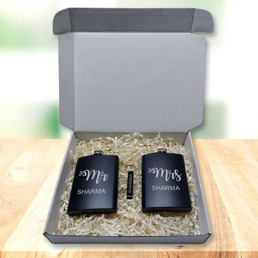 Personalized Engraved Set of 2 Hip Flasks with Opener Gift Box Mr Mrs
