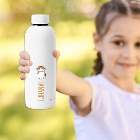 Childrens Personalised Drink Bottles with Name-Double Insulated Bottle for Travel, Shool, Home - BPA Free, Leakproof - Cat Design