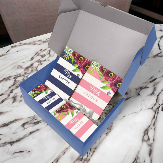 Travel Gift Set with a personalized gift box is an excellent gift for the frequent flyers. This premium box includes a custom passport cover and luggage tag. A personalized gift like this shows how well you know the recipient and that you put real thought into their interests, making even the most mundane gift anything but boring. Select from our wide range of designs, add customisation details using our personalization software, and done - your custom travel gift box will be on the way to the person of your choice.