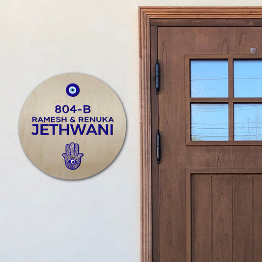 Evil Eye Name Plate for Home Round Nameplate with Turkish Hamsa Hand Nazar Protection Design - Available in Wood and Acrylic