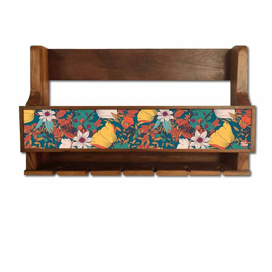Nutcase Designer Wooden Wine Rack Gloss Holder, Teak Wood Wall Mounted Wine Cabinet , 5 bottle Hangers for 6 Wine Glasses - Banana Leaves