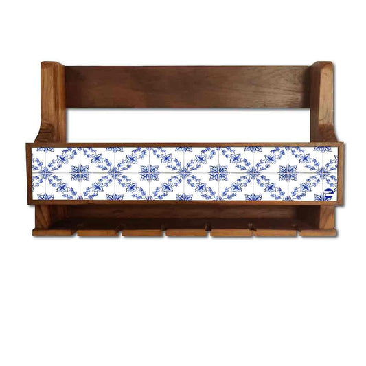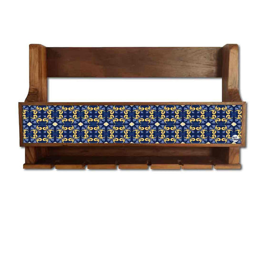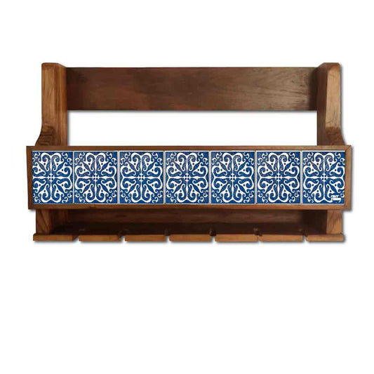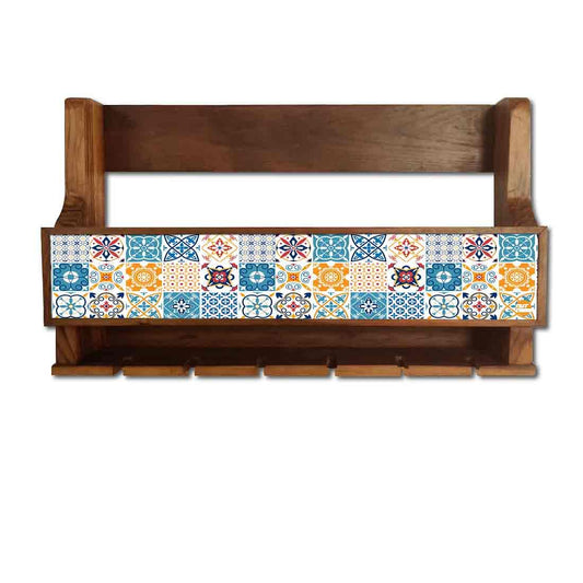 Wall Mounted Wine Rack Cabinet for Living Room - Stores 5 Bottles 6 Glasses - Spanish Pattern