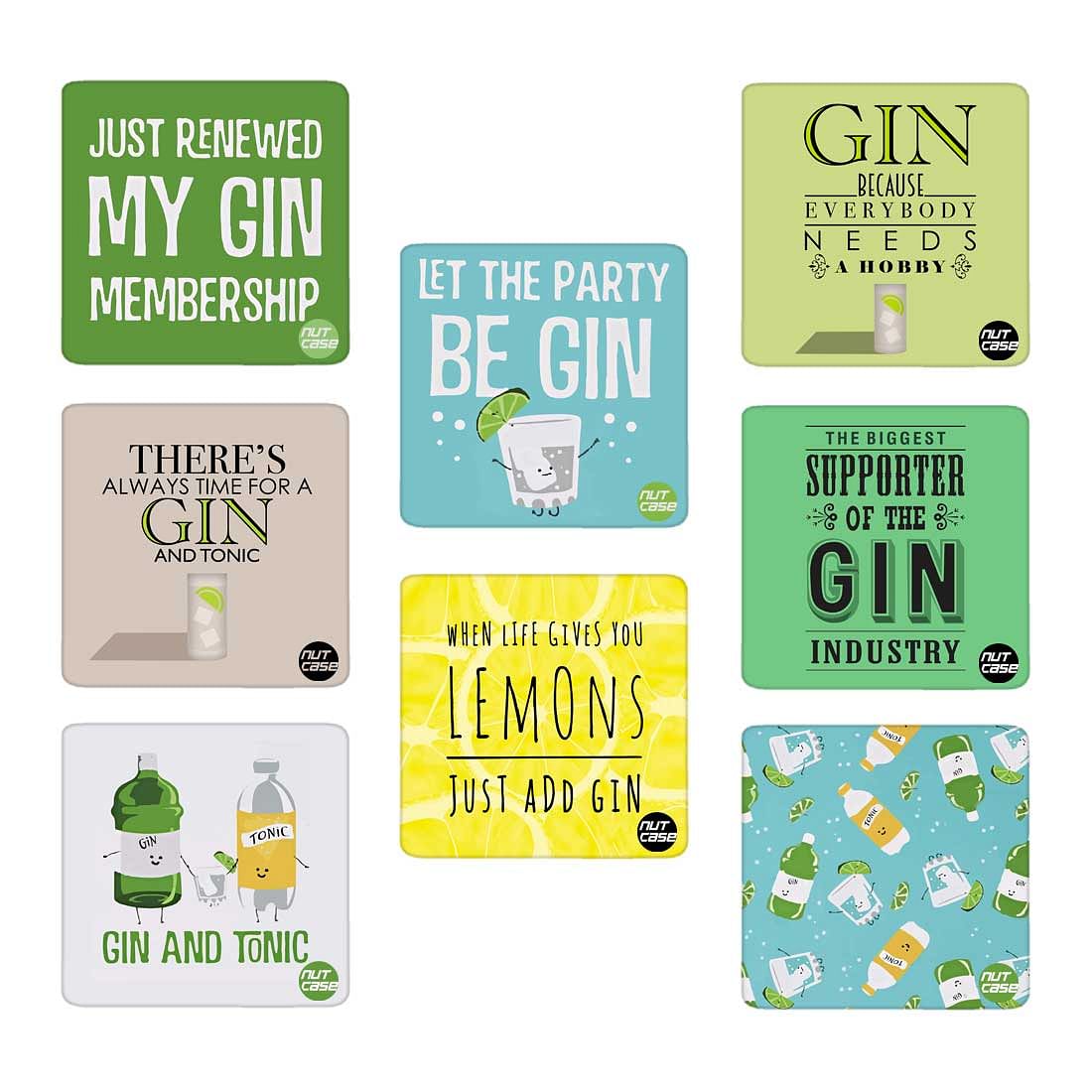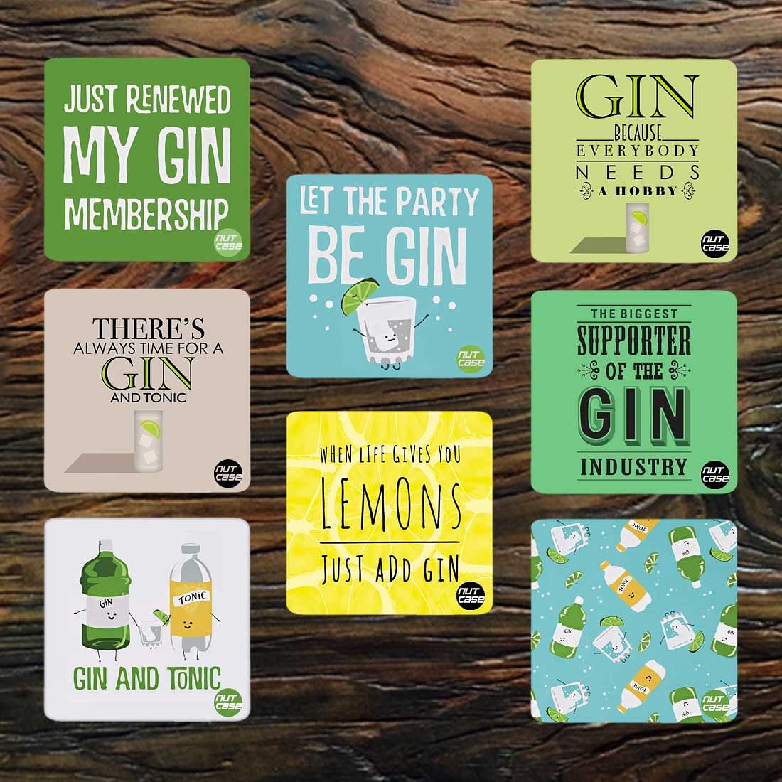 • Metal Coasters Set for Home Bar Set of 8 with quirky gin coasters