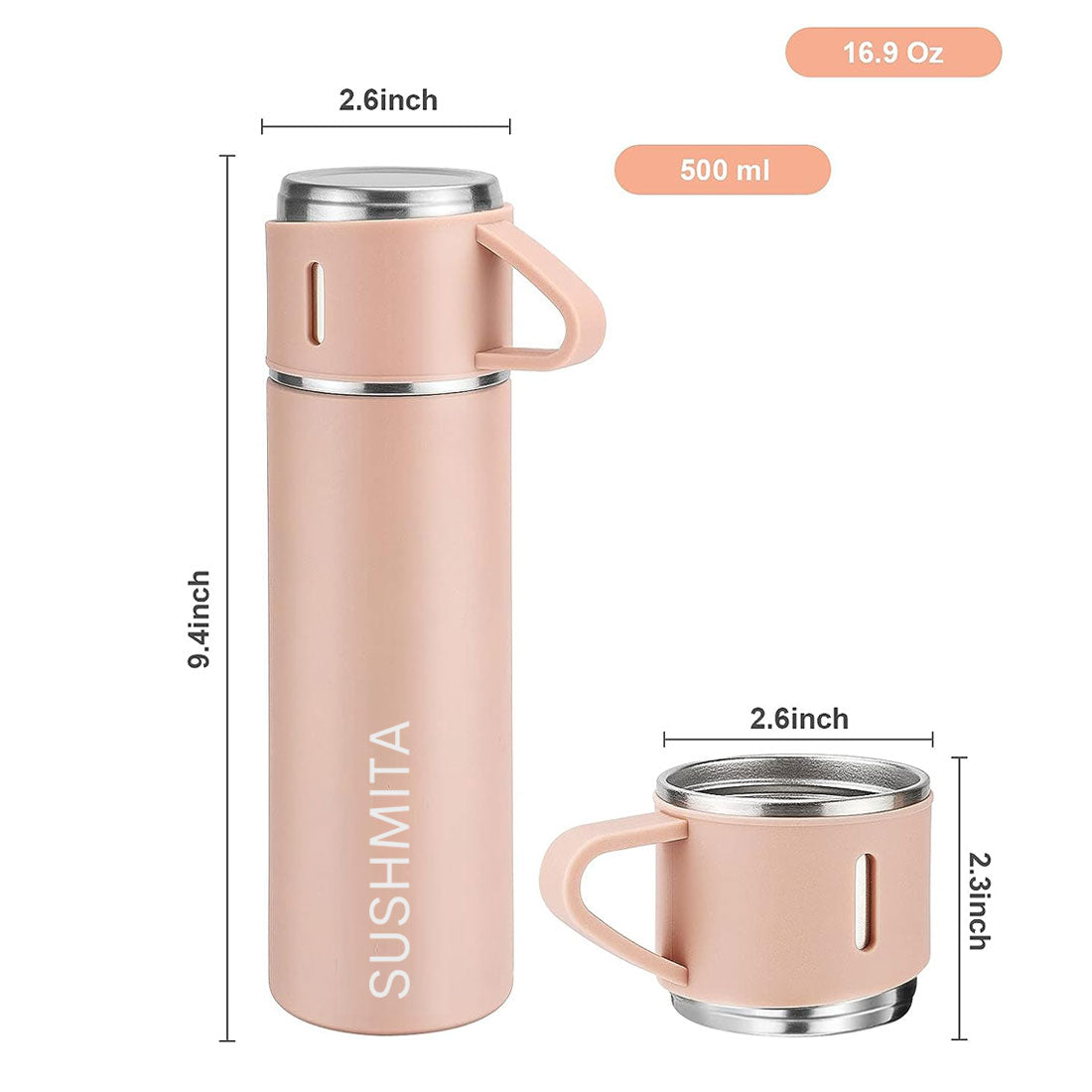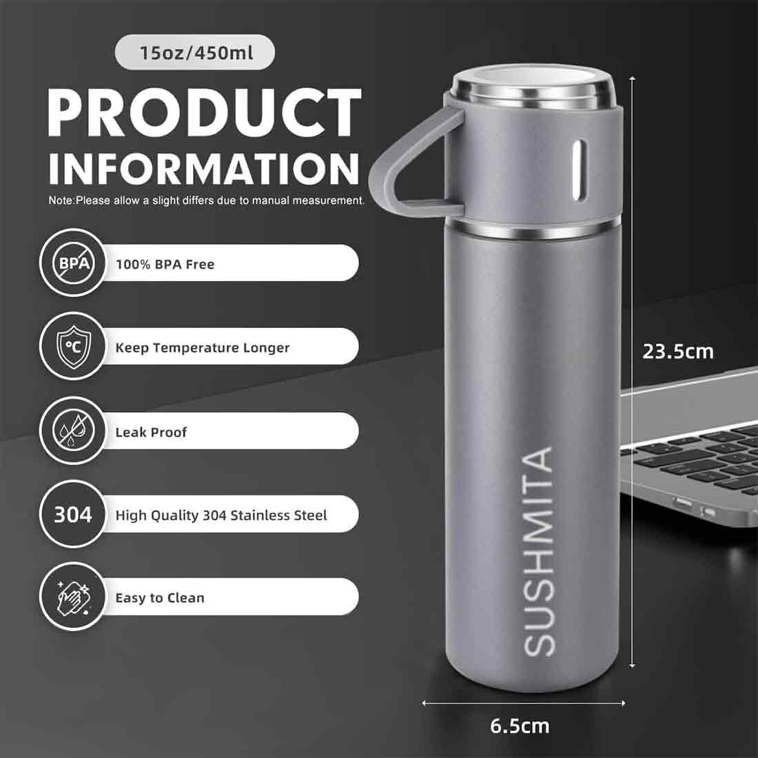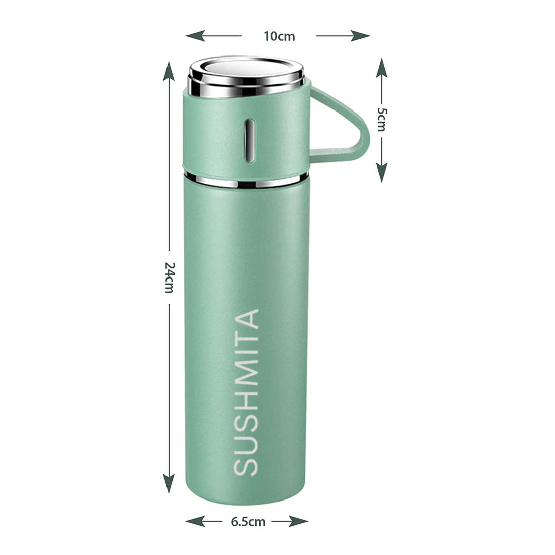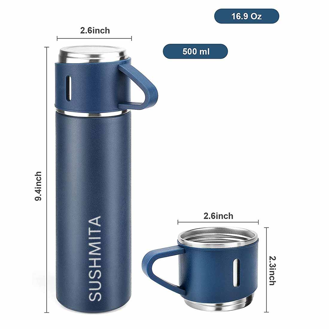 - Flask Size with Cup: 9.4-inch x 2.6-inch; Cup Size: 2.6-inch x 2.3-inch; Capacity: 500ml