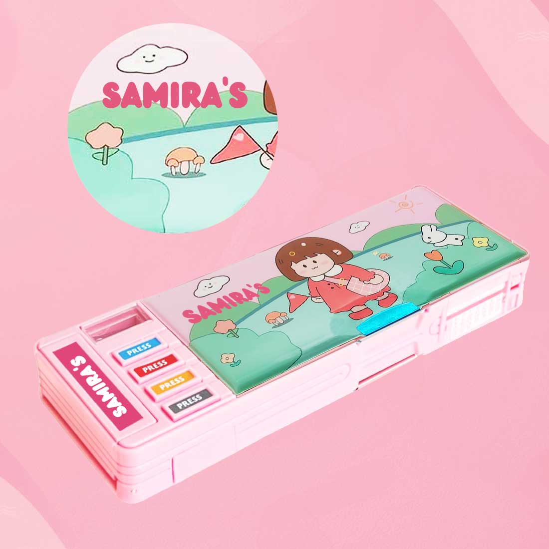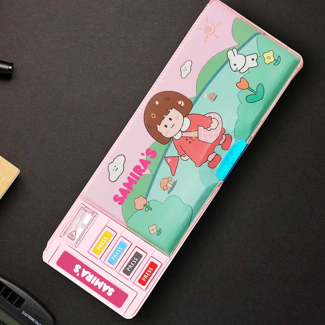 Customised Pencil Box Switch Operated Multi-functional Compass Box for Kids with Press buttons