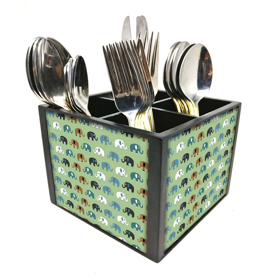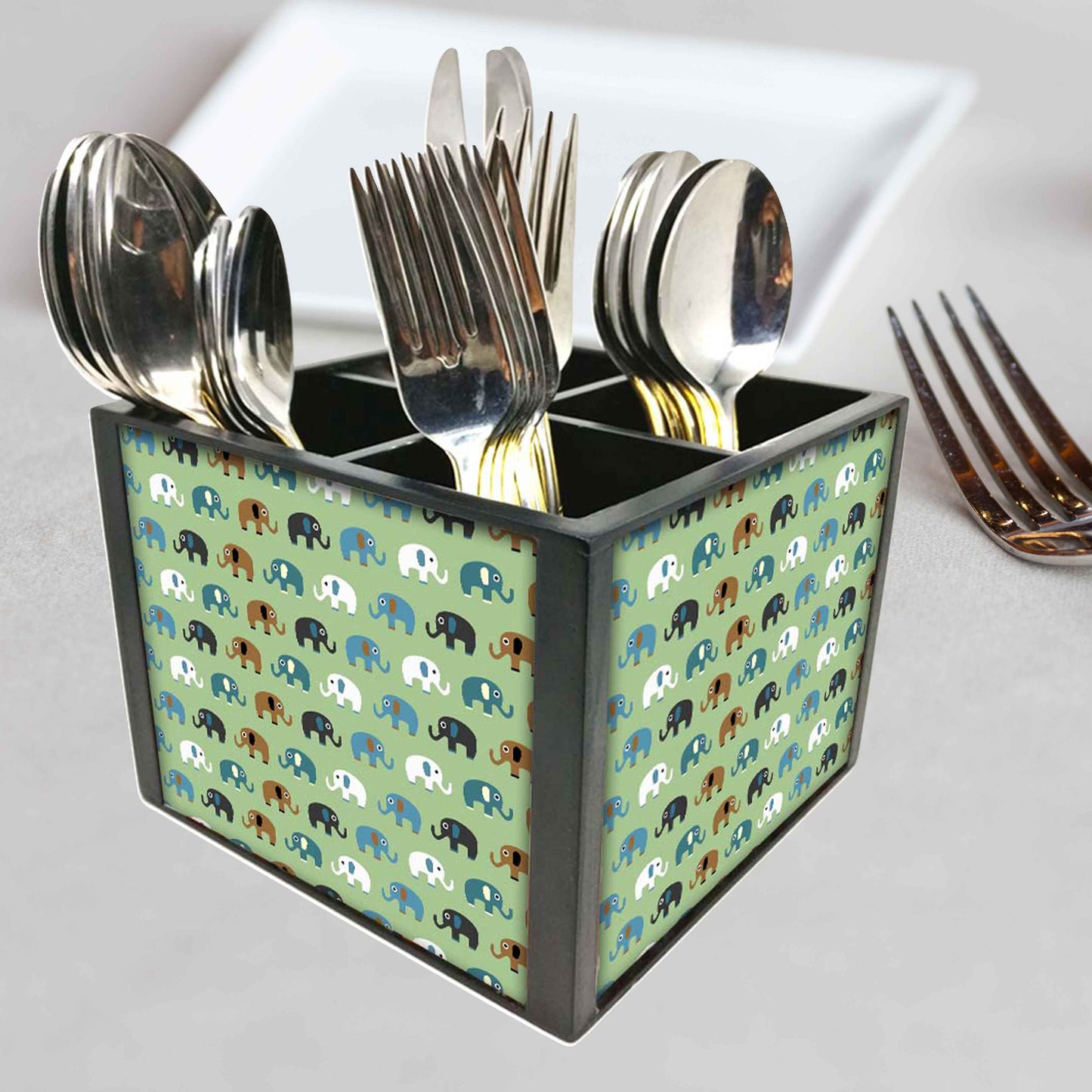 Organize your cutlery in style with our multi-functional 4 slot wooden storage box. Made from engineered wood with the design on all 4 sides this silverware organizer adds colour & style to your dining table or kitchen. Note: spoons not included for image representation only