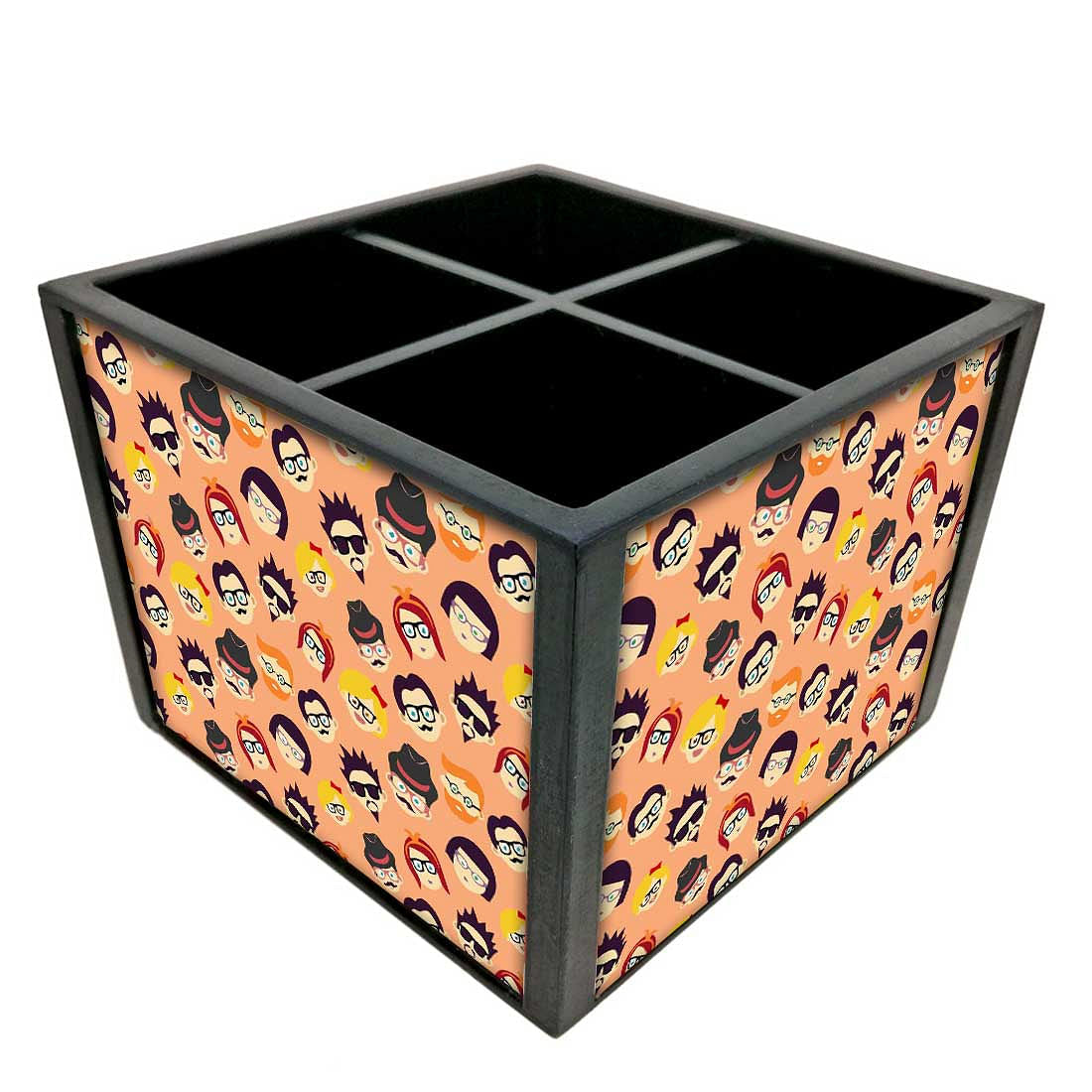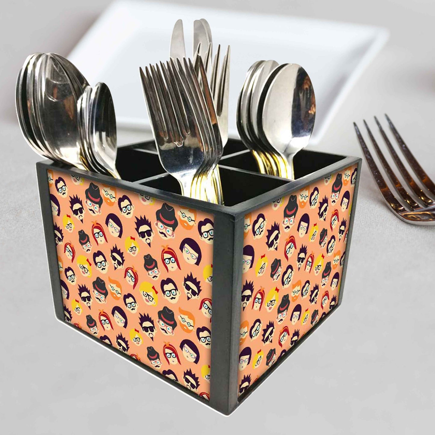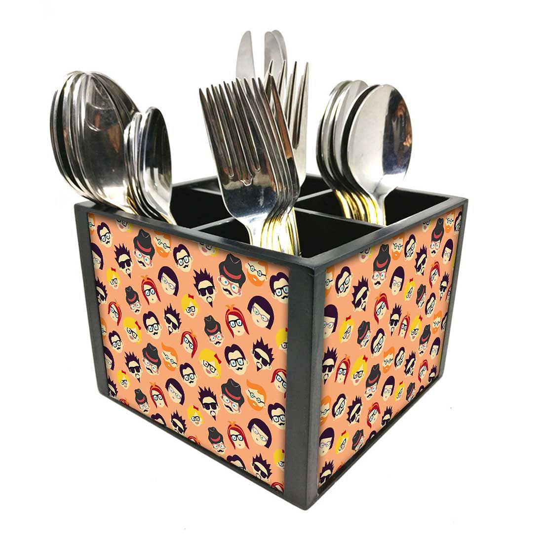 Hipster People Cutlery Holder Stand Silverware Caddy Organizer for Spoons, Forks & Knives-Made of Pinewood