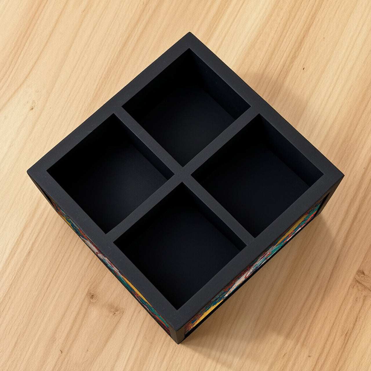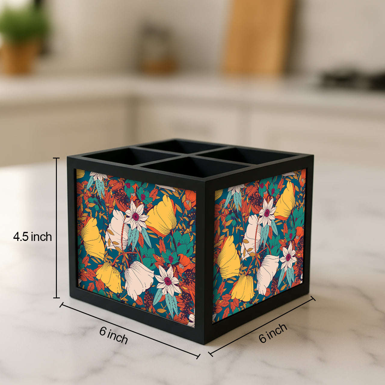 Organize your cutlery in style with our multi-functional 4 slot Cutlery Stand. Made from engineered wood with the design on all 4 sides this silverware organizer adds colour & style to your dining table or kitchen. Note: spoons not included for image representation only