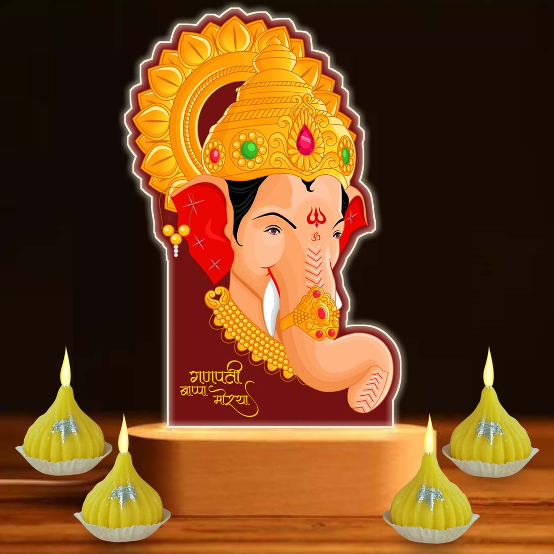 Ganpati LED Light Idol For Home With Silver Coin, Modak Candles & Lamp; - Ganesh Chaturti Gifts