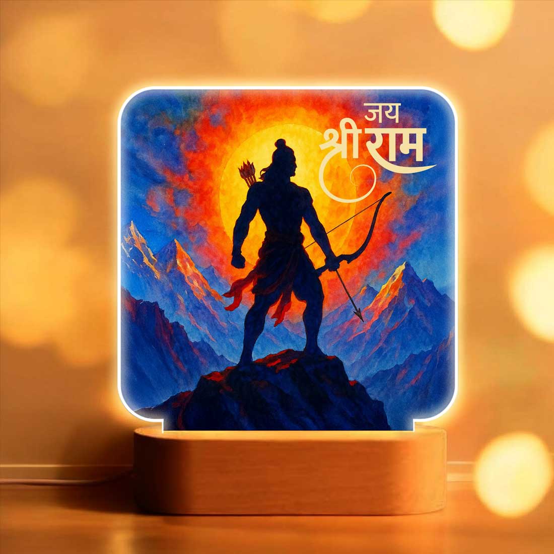 Lord Ram Night Light with Wooden Base – Warm White LED Lamp for Puja Room, Temple Lighting