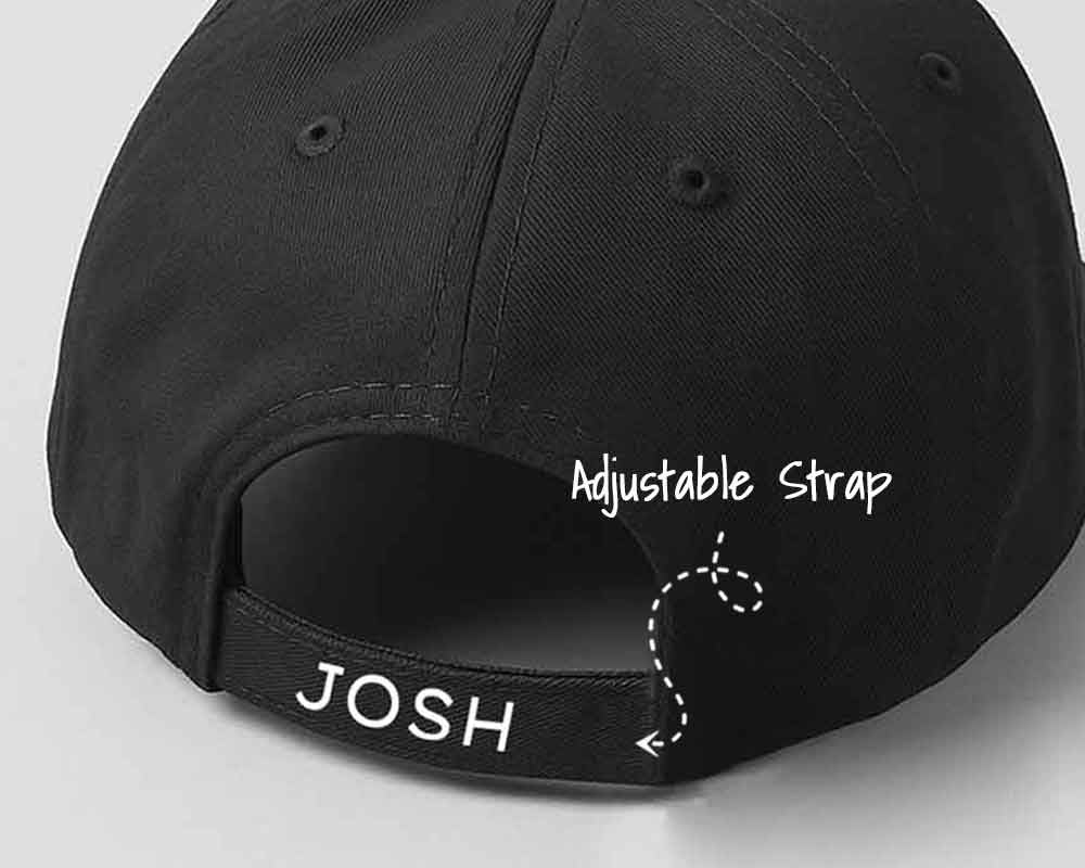 Adjustable Velcro strap that ensures a snug, customizable fit for all head sizes. Style meets comfort with easy sizing and a personalized name touch