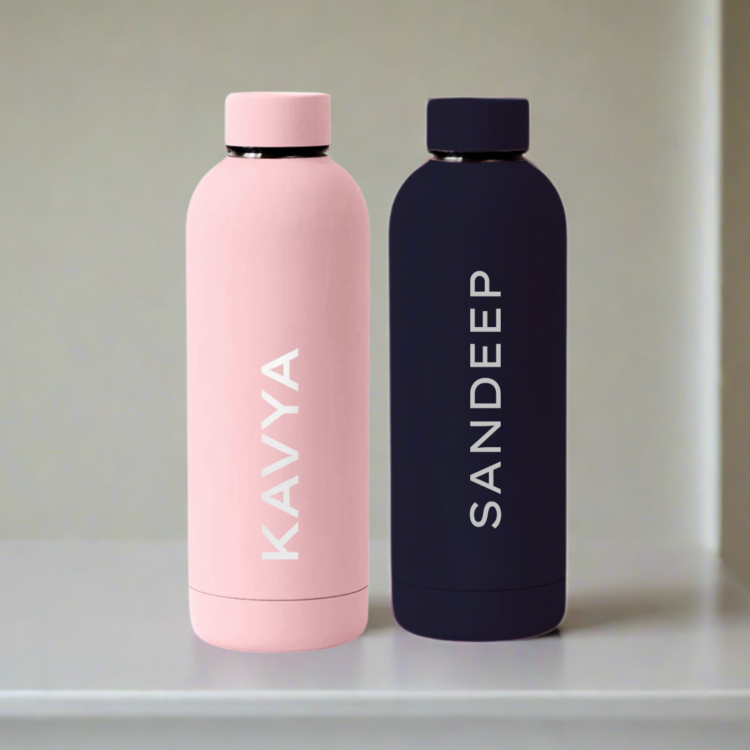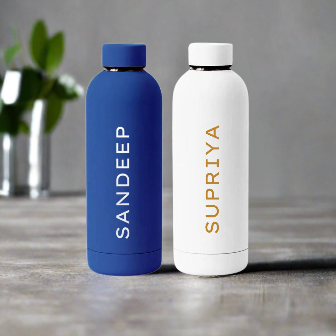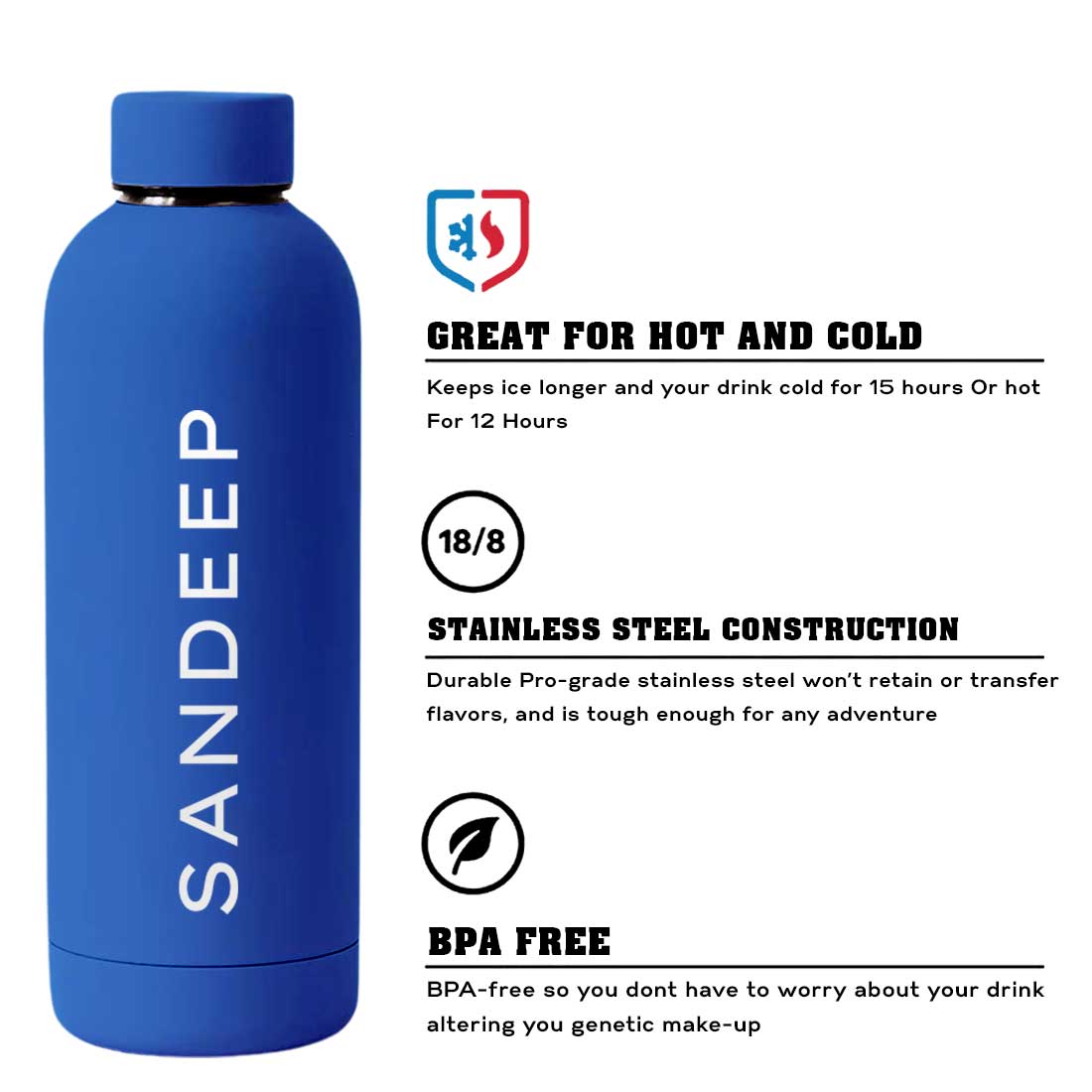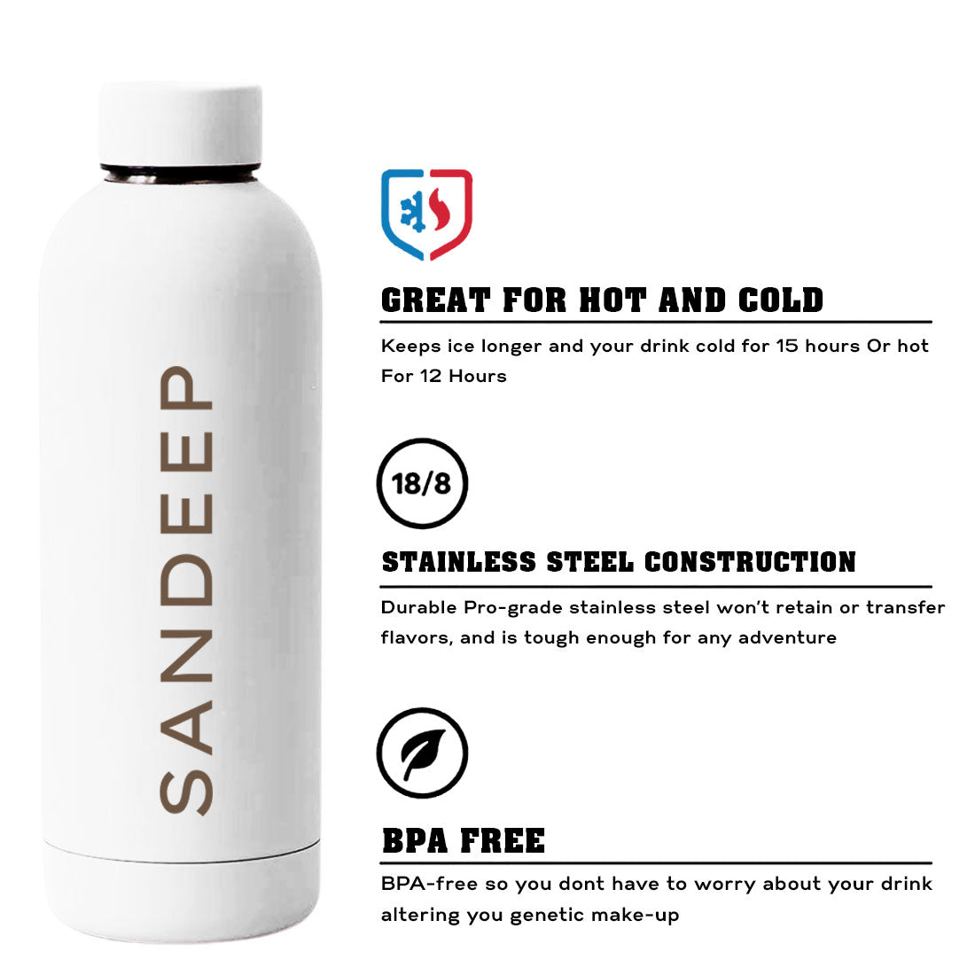 Nutcase Customized Water Bottles with Names are stylish and sturdy with luxuriously soft finish, BPA free, leakproof, double insulated - made with high grade stainless steel. These 500ml double-insulated stainless steel personalized bottles feature a luxurious finish, are BPA-free, leakproof, and designed to keep your beverages hot or cold for extended periods.These 500 ml bottles are perfect for home, office or travel-carry them in your handbag/backpack.