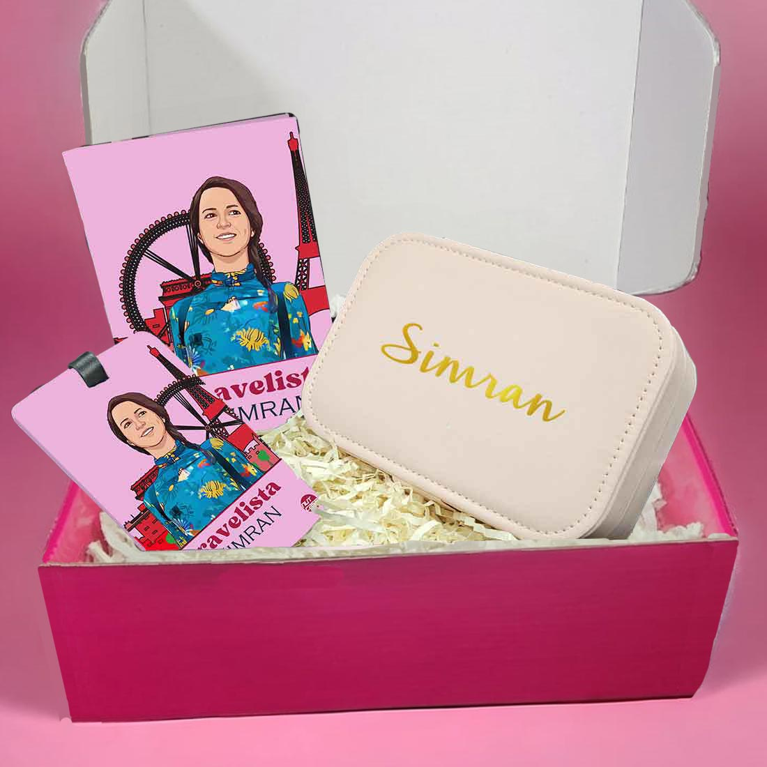 Personalised Gift Box Hamper For Women Comes with Passport Cover Photos Art and Pink Jewellery Box