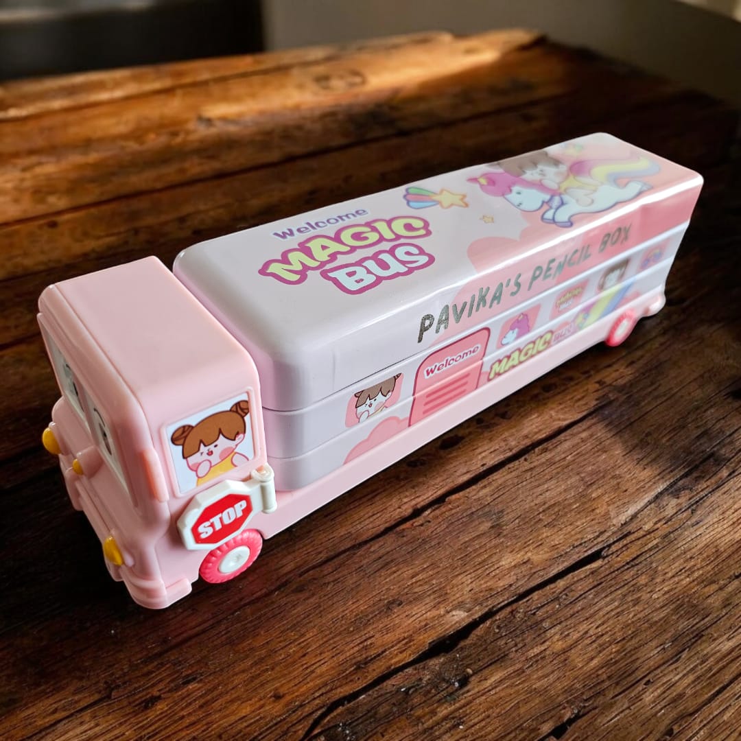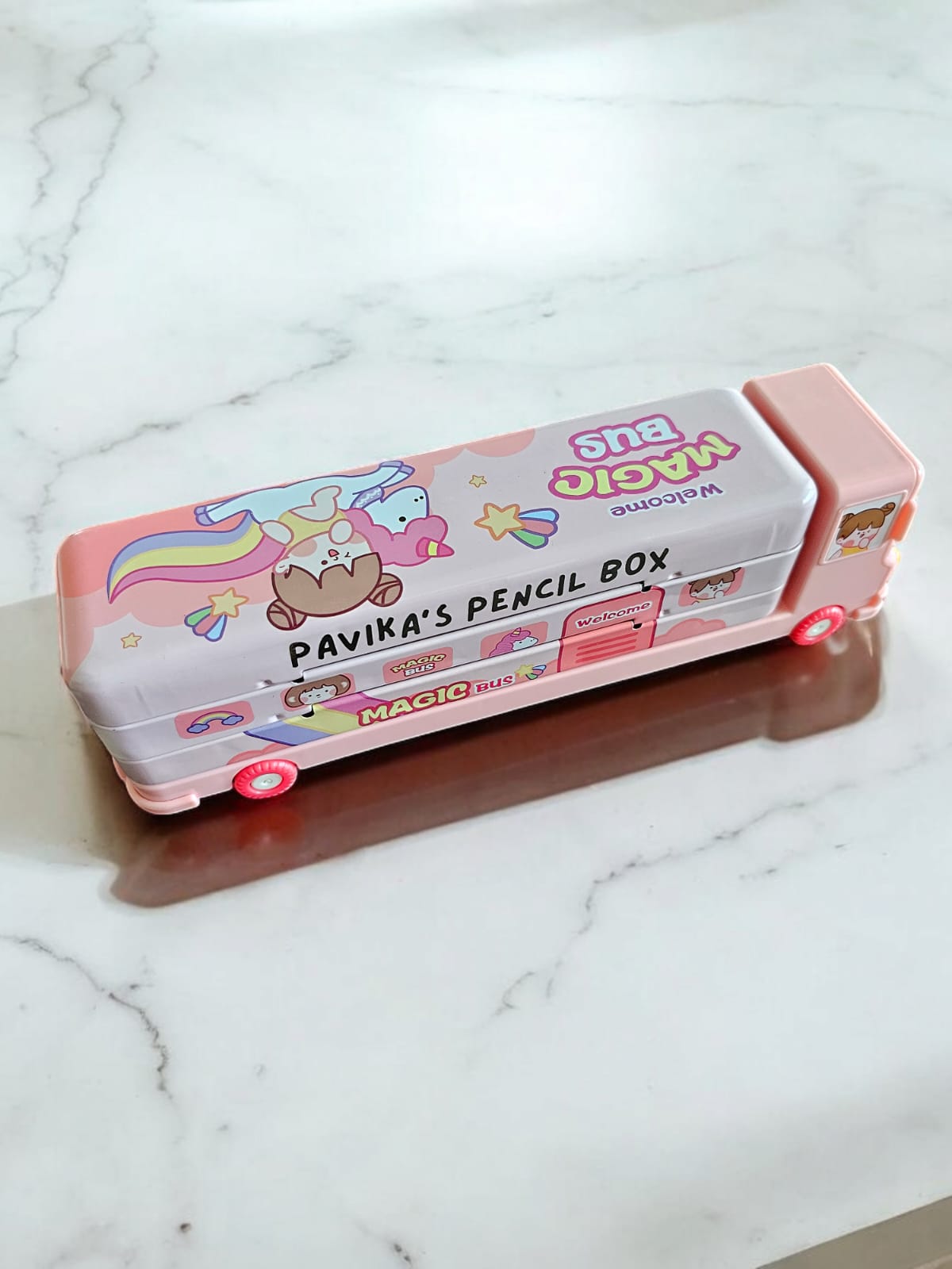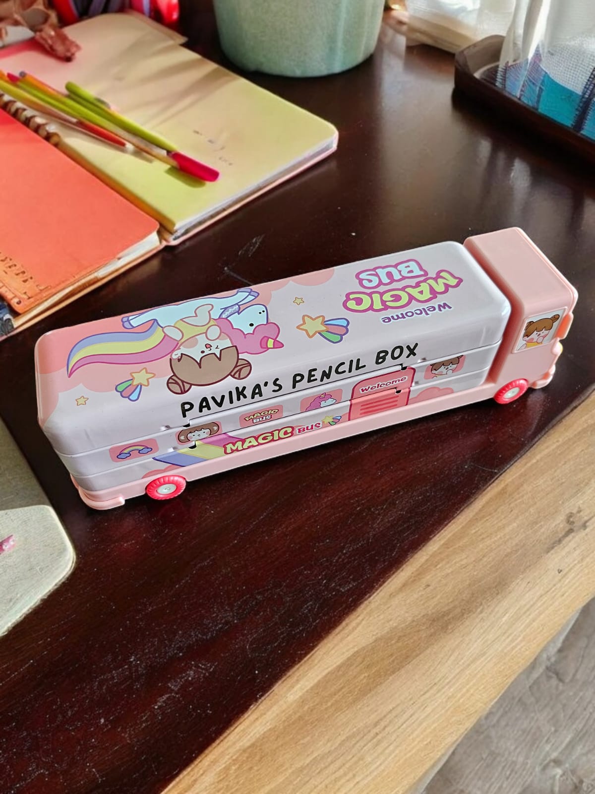 Personalised Pencil Box for Kids Magic Bus with Built-in Sharpener