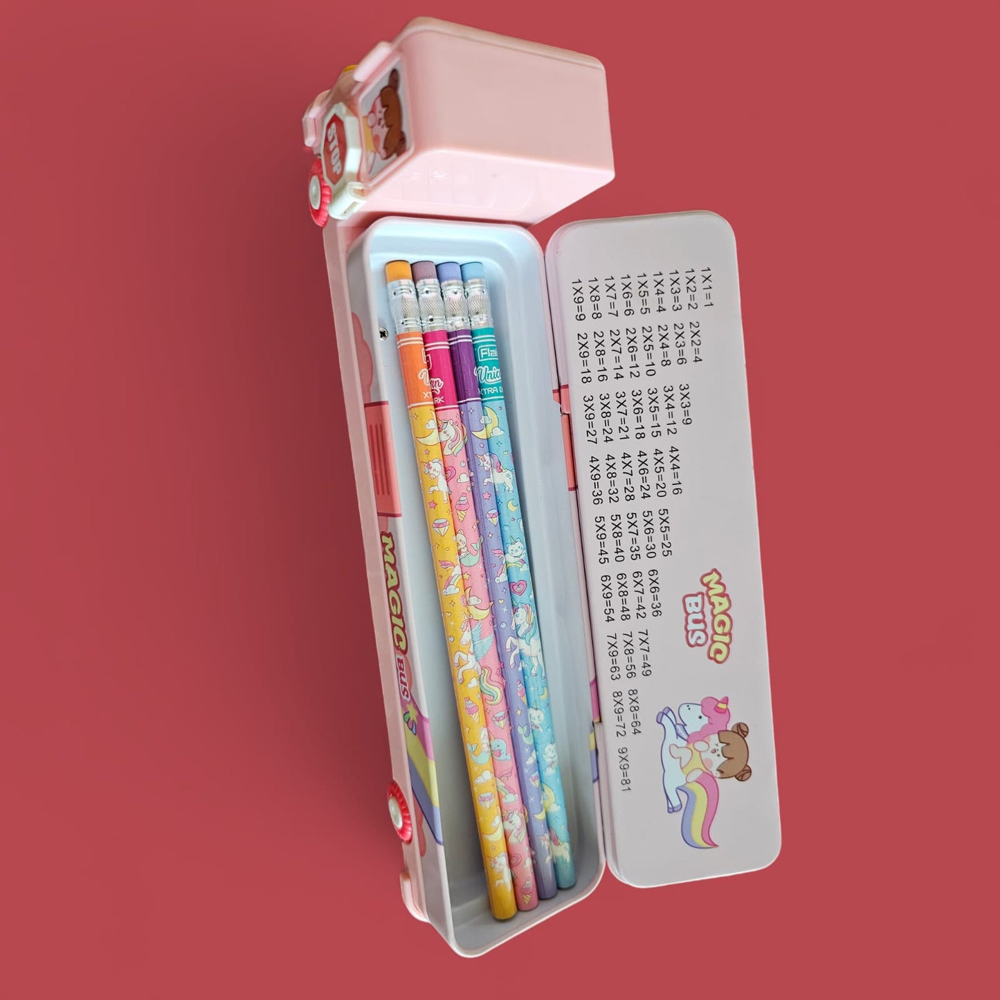 Nutcase personalised pencil box combines functionality with a fun, interactive design. Shaped like a "Magic Bus," this vibrant pencil box features adorable characters and playful colors, making it an exciting accessory for young students. One unique feature is the built-in sharpener, cleverly integrated into the "STOP" sign, adding convenience while maintaining the playful theme. The compartments provide ample space for pencils, rulers, and other stationery essentials, while the inner lid cleverly displays multiplication tables, adding an educational element. The box's bus-like form with wheels makes it both practical and engaging, ideal for children who enjoy interactive designs. It's perfect for keeping things organized while adding a creative touch to daily school life.