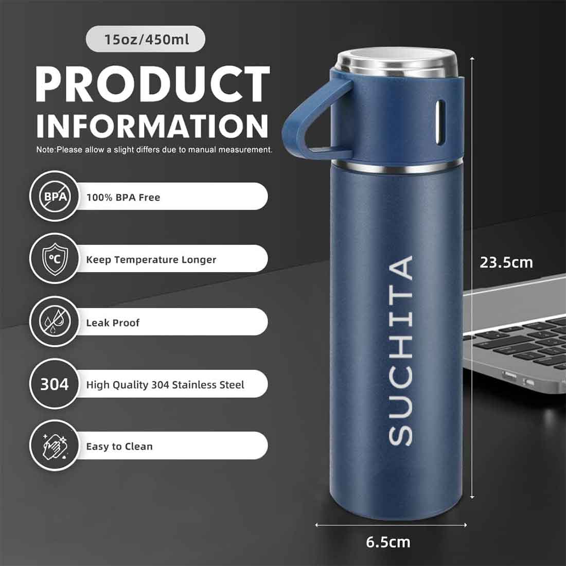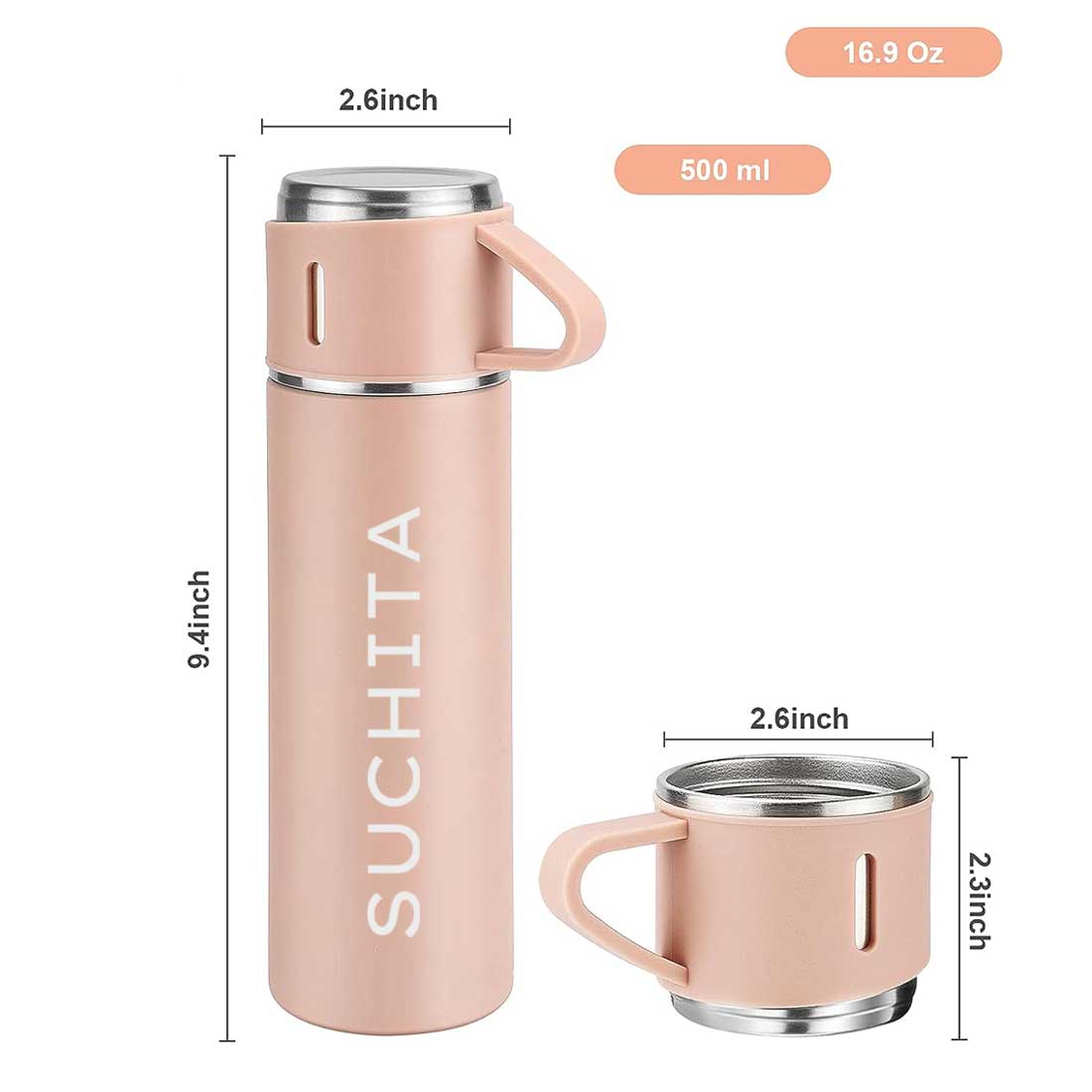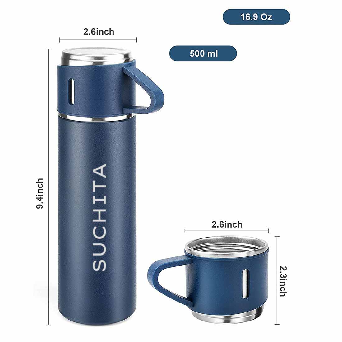 - Flask Size with Cup: 9.4-inch x 2.6-inch; Cup Size: 2.6-inch x 2.3-inch; Capacity: 500ml
