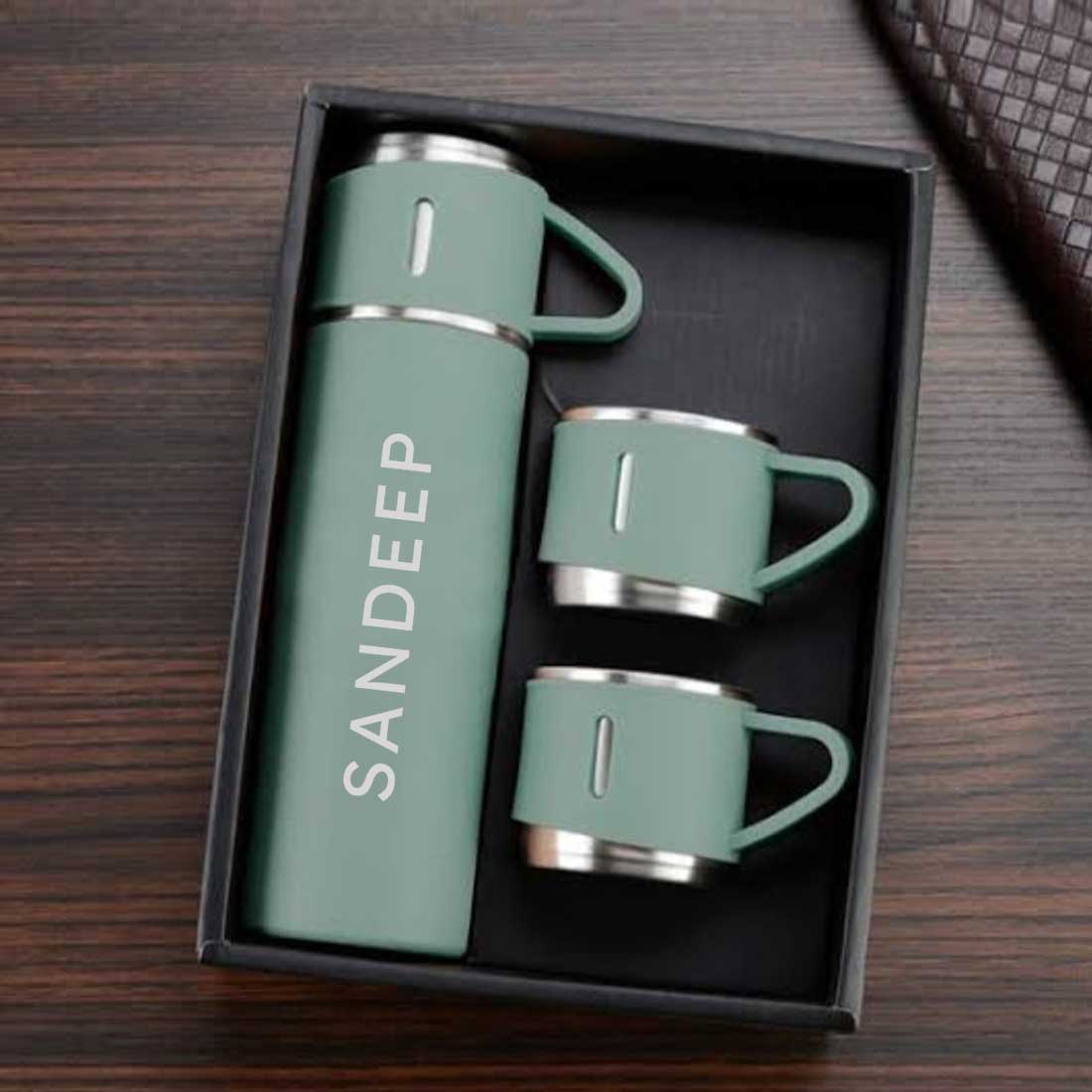 Personalised Travel Mug Thermos With 2 Cups Gift Box Set - Add Name