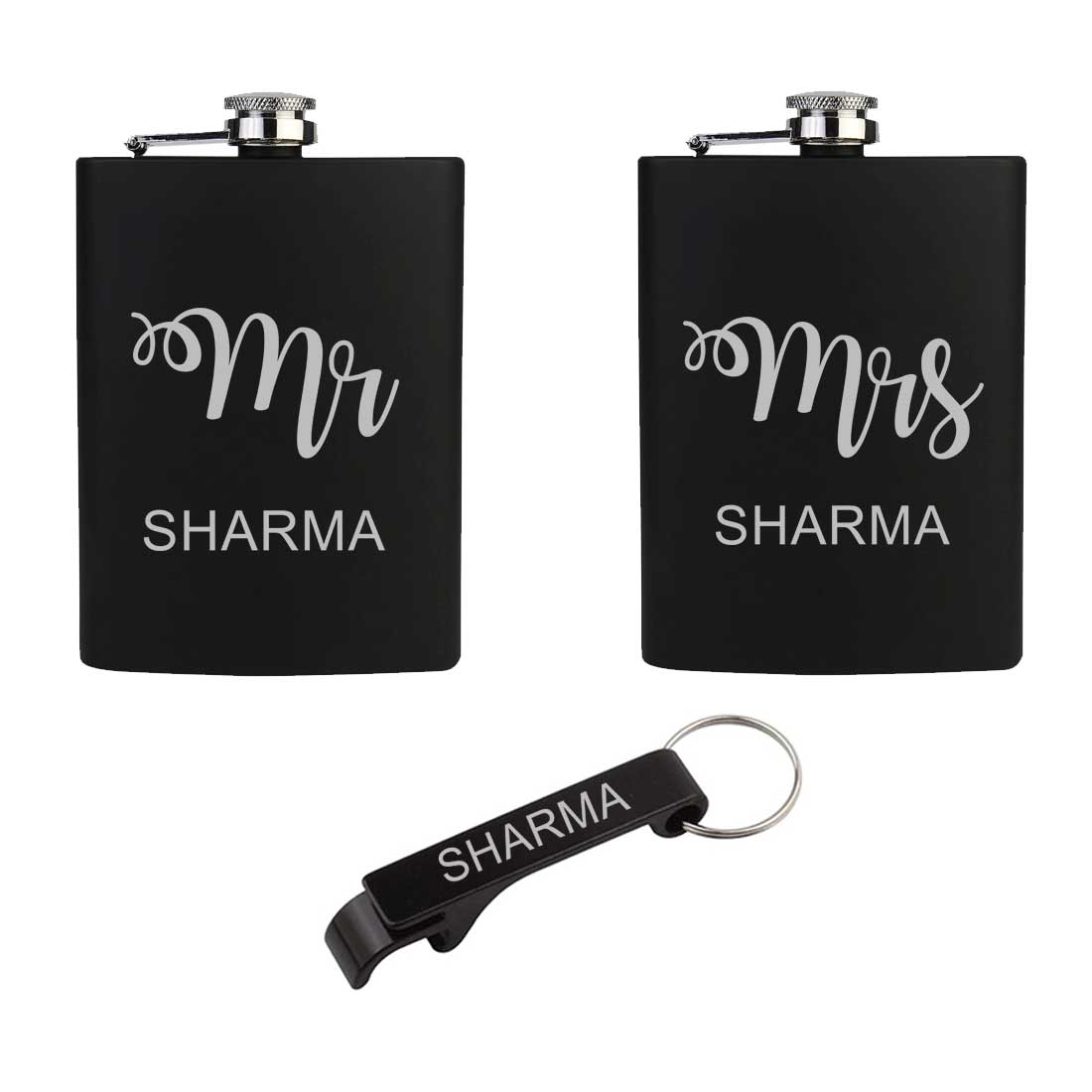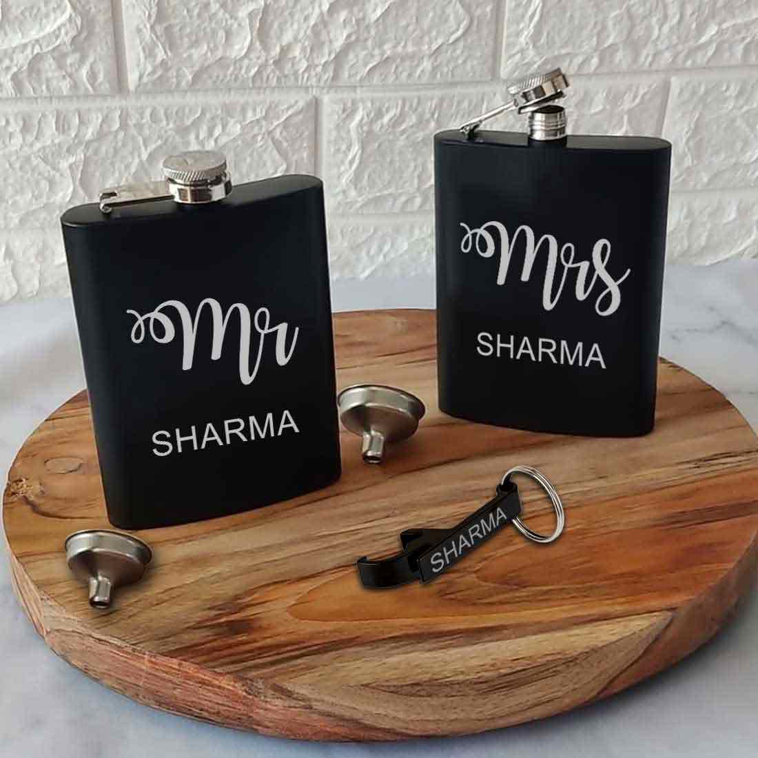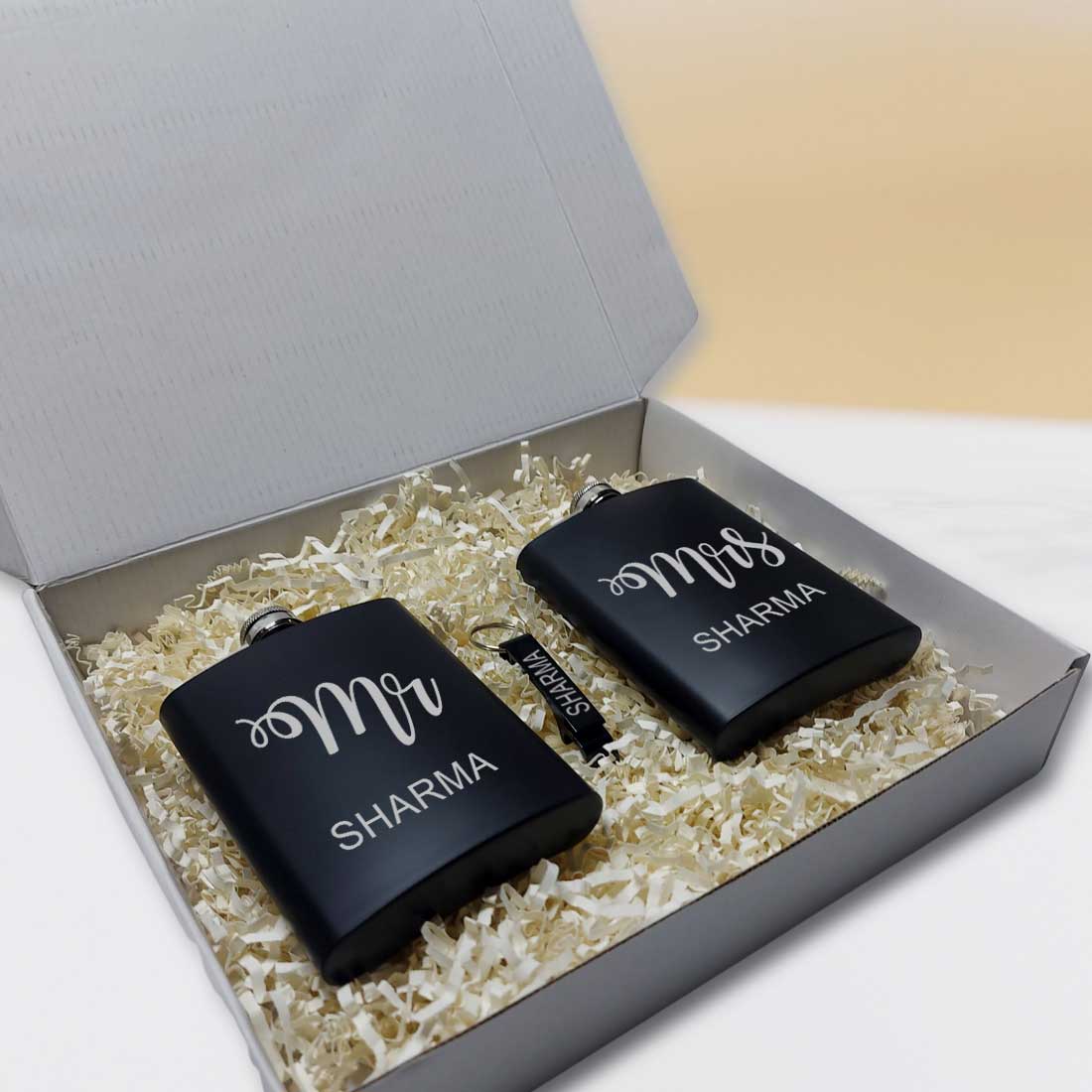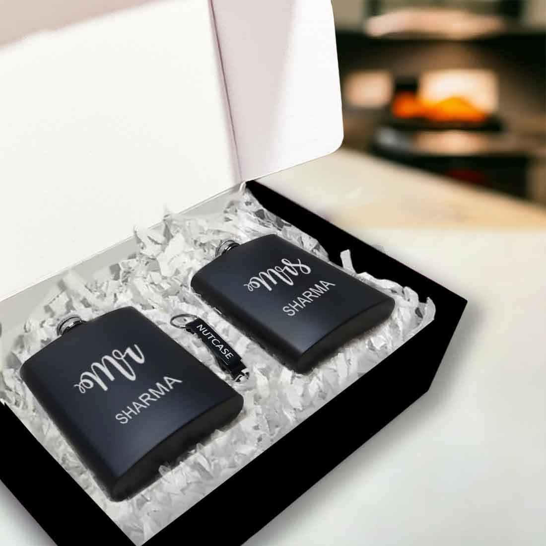 Personalized Engraved Set of 2 Hip Flasks with Opener Gift Box Mr Mrs