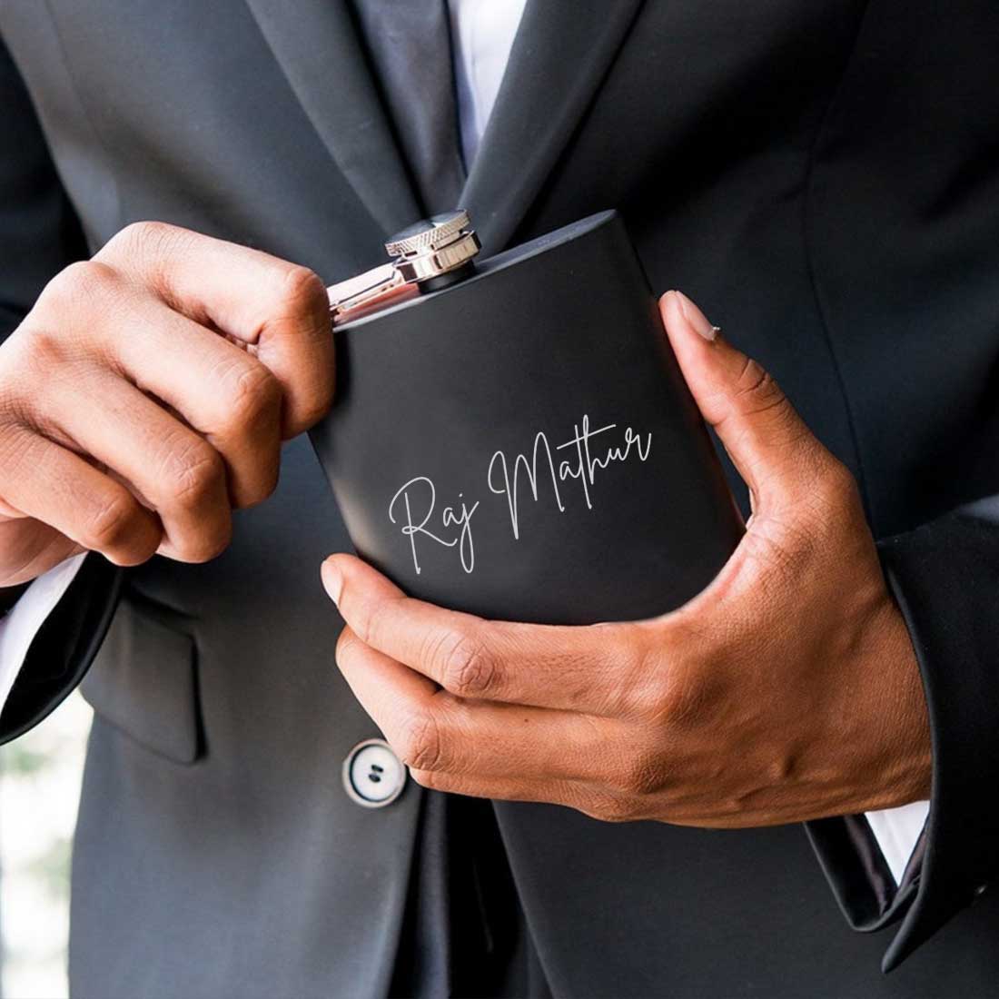 This designer flask by Nutcase offers a stylish, personalized touch with durable stainless steel construction