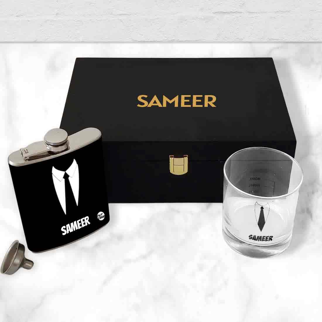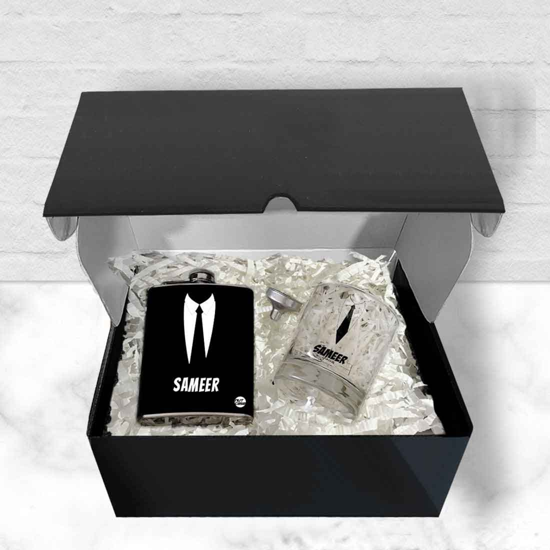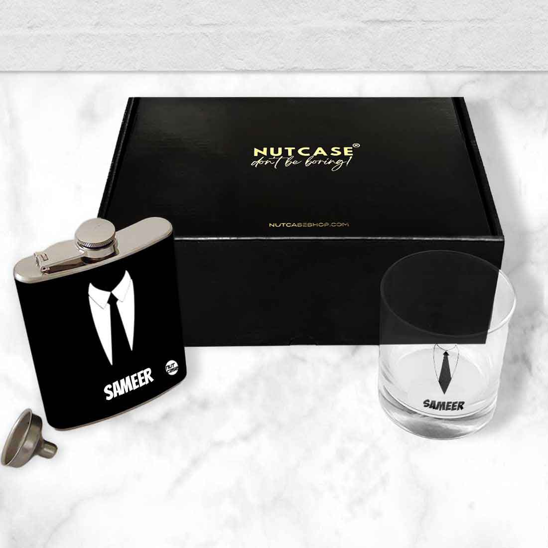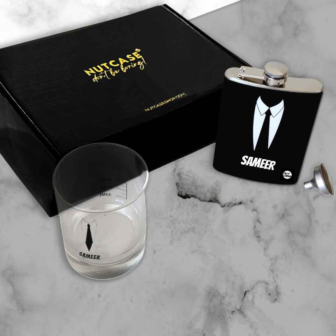 Personalized Whiskey Glass Hip Flask Gift Set Box - Suit Up
