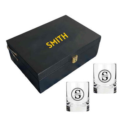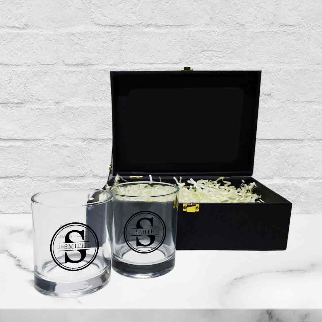 • Gift Set for Men includes a Premium Gift Box, Two Whiskey Glasses customized with name and initial.