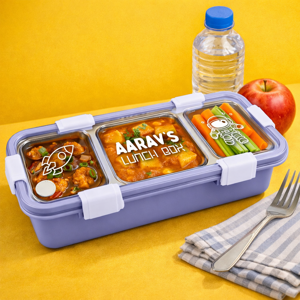 It’s got three separate sections for portion control and a secure, airtight seal to prevent leaks. Custom-engraved with your name, it’s the perfect upgrade for kids' school bags or your office desk.