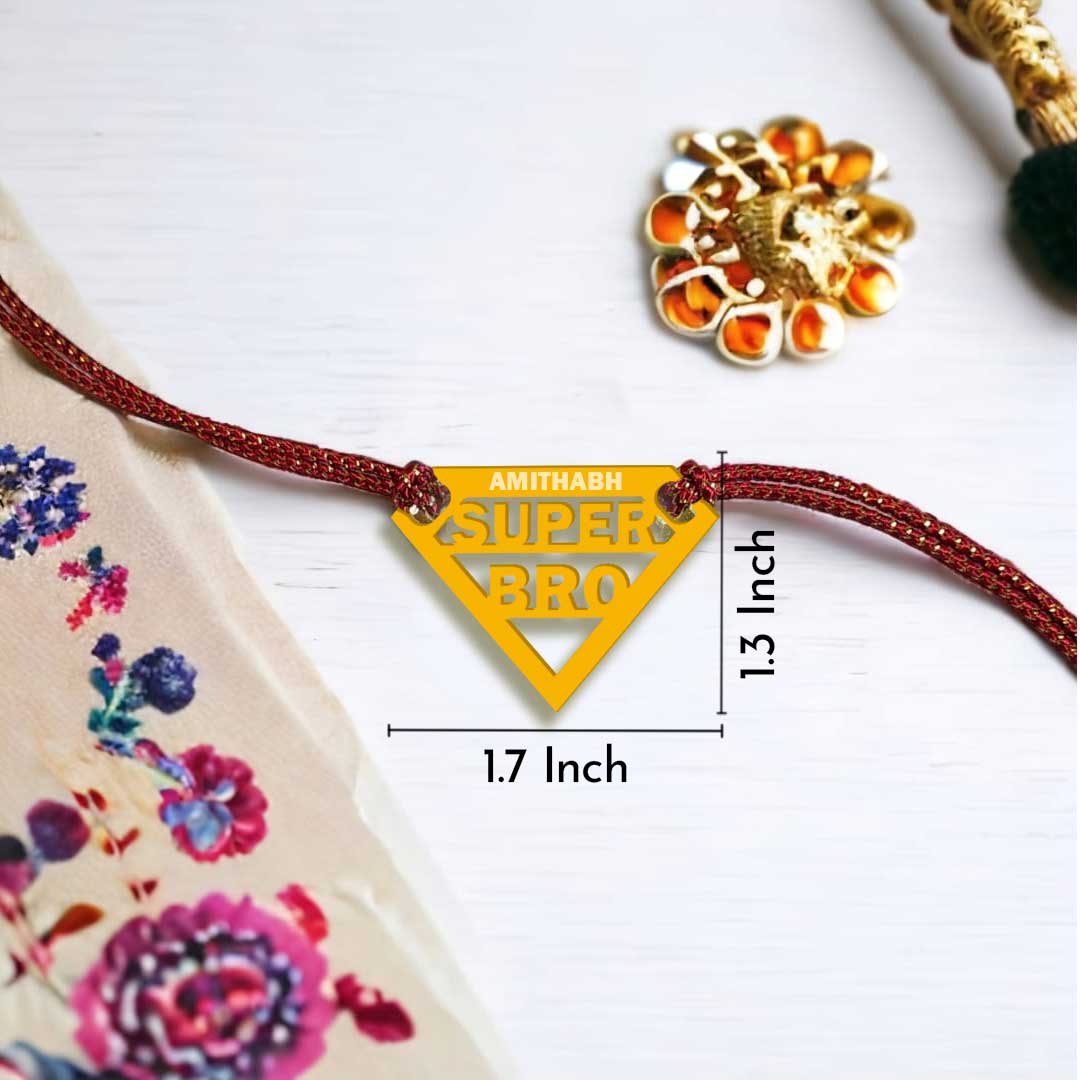 • Golden Acrylic "Super Bro" Rakhi – Durable and trendy rakhi symbolizing your brother’s superhero status.
