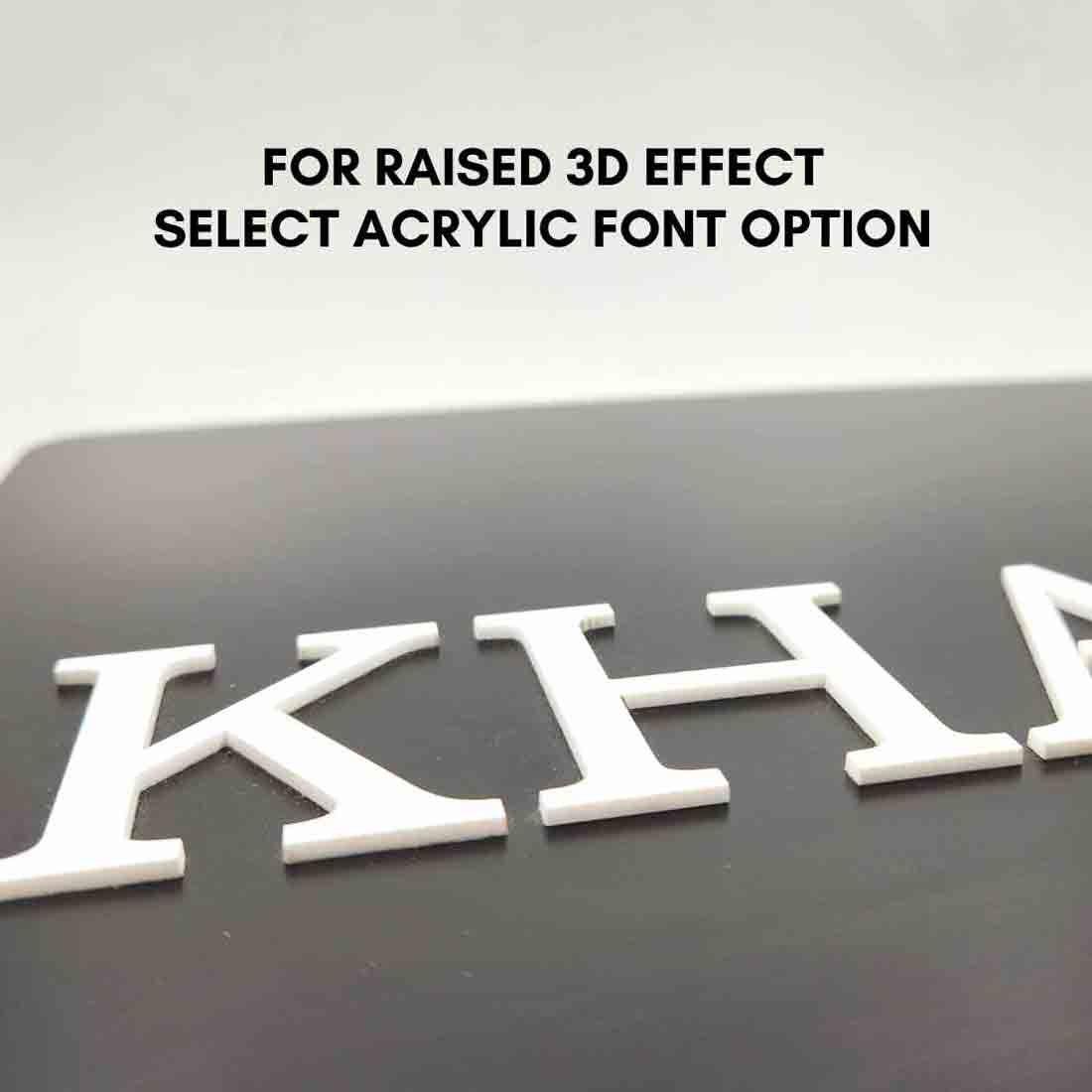 Stainless Steel Metal Name Plate come in two font options. Flat vinyl sticker or 3D/Raise AcrylicFont.