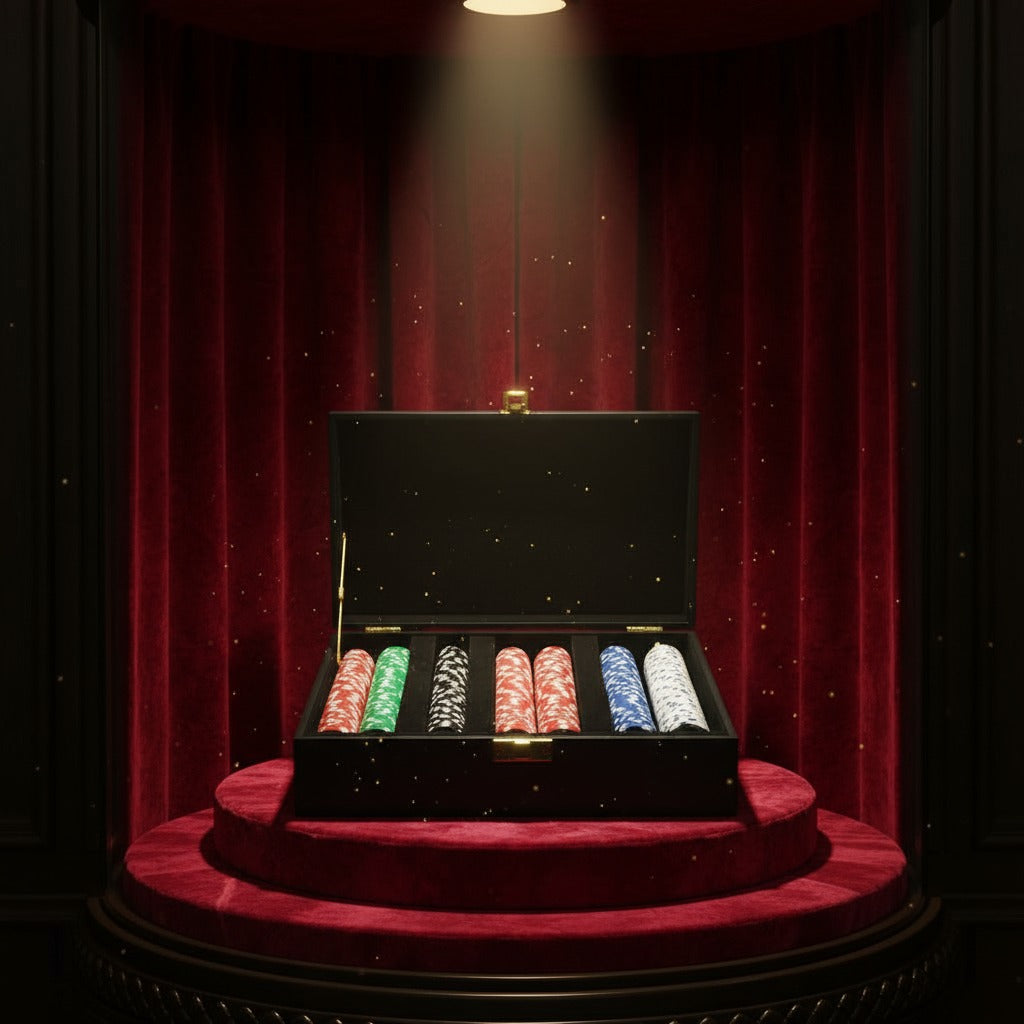 Elevate your game with our premium faux leather chip box. Store up to 300 custom casino chips and playing cards set in style