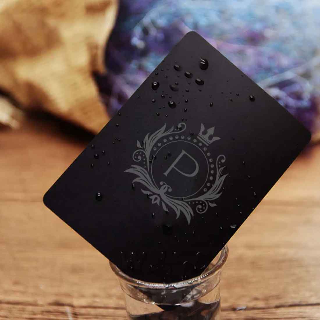 • Personalized Playing Cards – Durable, non-tearable black cards with initials, names, or monograms in a stylish grey finish.