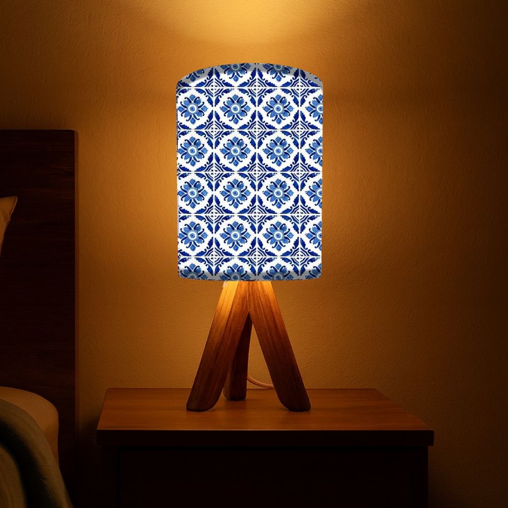 Wooden Bedside Lamp Mini Tripod Light for Bedroom Living Room-Blue Flower Tiles (3W LED Bulb Included)
